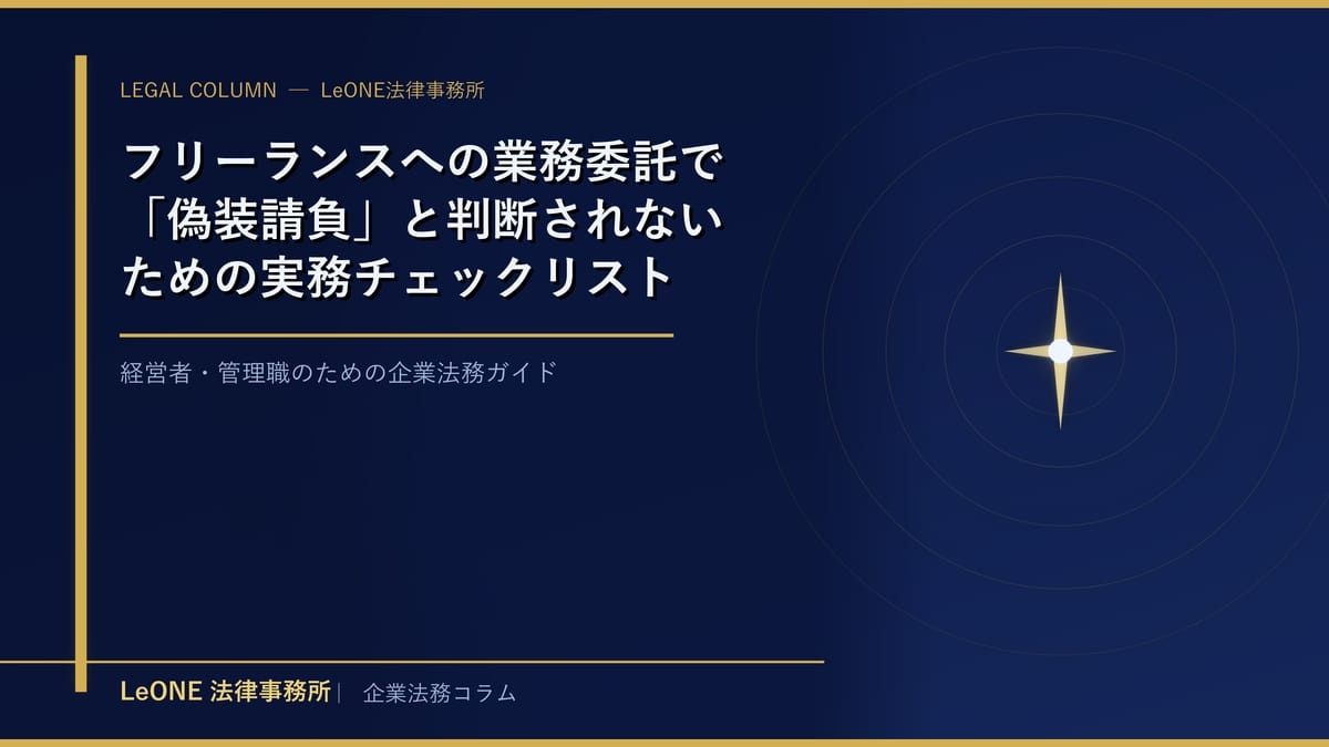 偽装請負とは、請負や業務委託という契約形式をとりながら、発注者が受託者(フリーランス等)に対して直接指揮命令を行っている状態を指します。これは職業安定法や労働者派遣法に違反する行為であり、行政指導・勧告の対象となるだけでなく、場合によっては刑事罰(1年以下の懲役または100万円以下の罰金)が科される可能性もあります。